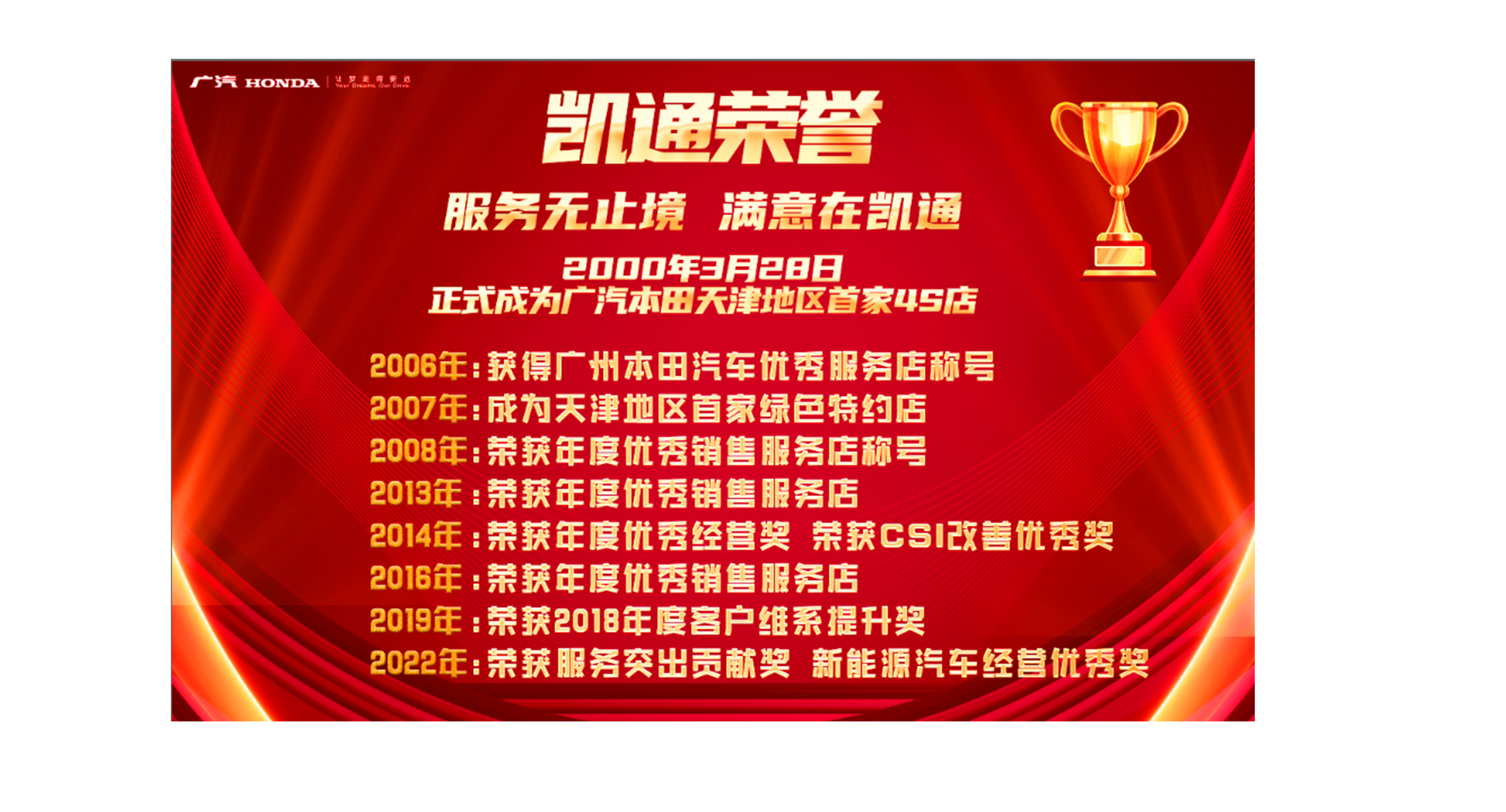 天津凱通汽車服務(wù)發(fā)展有限公司在廣汽本田汽車有限公司及社會各界朋友的大力支持下,恪守“服務(wù)只有起點,滿意沒有終點;質(zhì)量精益求精,服務(wù)盡善盡美”的服務(wù)宗旨,不斷開拓、進取,以可靠的質(zhì)量、低廉的價格、優(yōu)質(zhì)的服務(wù)竭誠為廣大客戶服務(wù)。服務(wù)無止境,滿意在凱通!